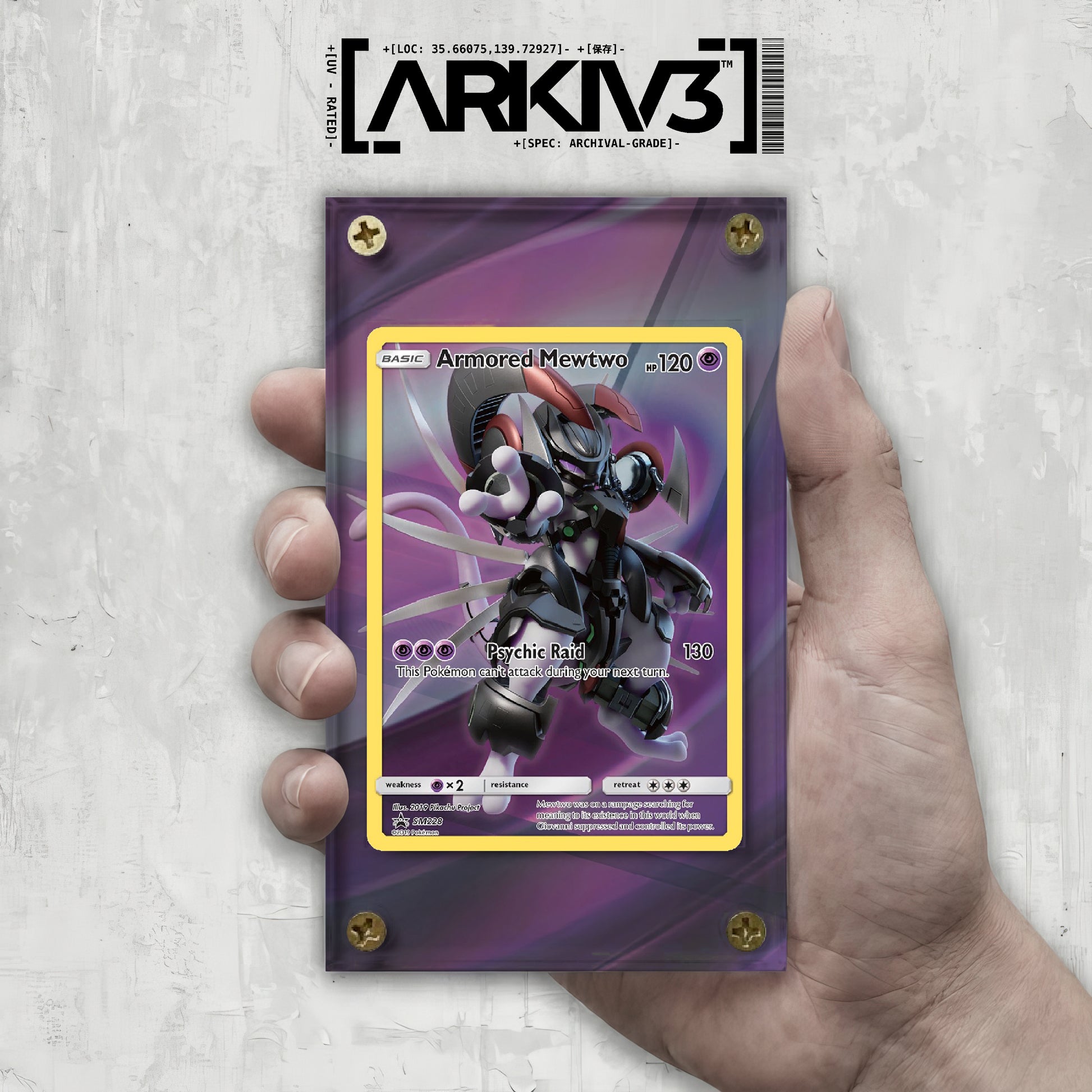 ![[UNIT: SM228] // Armored Mewtwo Extended Art Display Case - Raw](http://www.arkiv3.com/cdn/shop/files/ArmoredMewtwoSM228HandMockup.jpg?v=1766443845&width=1445)